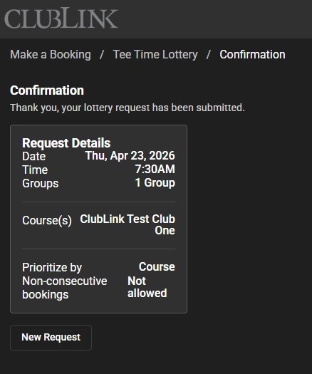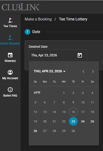 You can request a tee time at another Club the same way you would for your Home Club. Simply select the desired ClubLink property and your preferred time range when building your ballot.