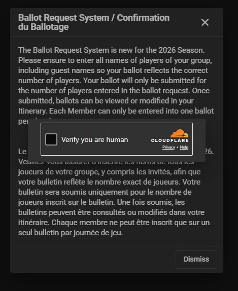 3. Review the informational pop-up outlining the new 2026 season rules. Complete the short Cloudflare "Verify you are human" security check if prompted, then click "Dismiss."