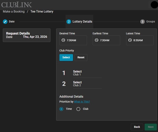 7. Choose your priority method under "Additional Details," then click "Next." Selecting Course tells the system to prioritize your top-ranked location, searching for all available times within your window at your first-choice course before moving to your second. Selecting Time tells the system to prioritize your schedule, checking all selected courses for your exact requested time before gradually expanding the search outward.