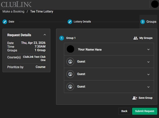 Please note that including a guest will restrict your ballot to times on the tee sheet where guest play is permitted. Tee time restrictions for guests vary by day, time of day, and location.
